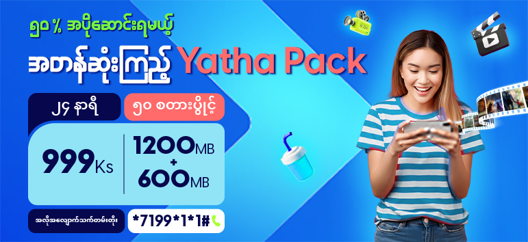 T24 နာရီ 1200MB + 600MB ပါပြီး ၉၉၉ ကျပ်ပဲကျသင့်တဲ့ ၂၄ နာရီစာ Yatha Pack ကို ဝယ်ယူလိုပါက Website (သို့) ATOM Store App (သို့) *7199*1*1# ကို ခေါ်ဆိုပြီး ဝယ်ယူနိုင်မှာဖြစ်ပြီး ကြိမ်ဖန်များစွာဝယ်ယူမှုအတွက် ပက်ကေ့ချ်သက်တမ်းတိုးသွားမှာပဲဖြစ်ပါတယ်။