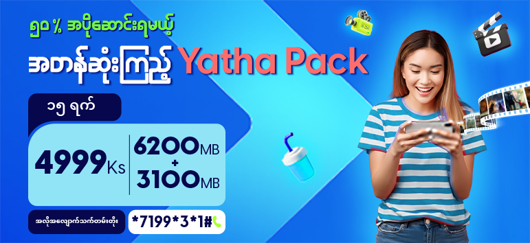 6200MB + 3100MB ပါပြီး ၄,၉၉၉ ကျပ်ပဲကျသင့်တဲ့ ၁၅ရက်စာ 15 Days Yatha Pack ကို ဝယ်ယူလိုပါက Website (သို့) ATOM Store App (သို့) *7199*3*1# ကို ခေါ်ဆိုပြီး ဝယ်ယူနိုင်မှာဖြစ်ပြီး ကြိမ်ဖန်များစွာဝယ်ယူမှုအတွက် ပက်ကေ့ချ်သက်တမ်းတိုးသွားမှာပဲဖြစ်ပါတယ်။
