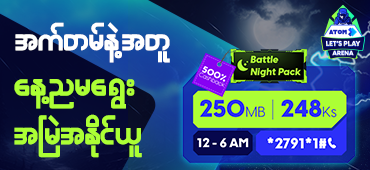 Battle Night Pack သည် Night Gamers များအတွက် အထူးပြုထားသည့် ဒေတာပက်ကေ့ဂျ် ဖြစ်ပြီး၊ ဂိမ်းများကို ပိုသက်သာစွာ ကစားနိုင်စေပြီး အပို Cashback လည်း ရရှိစေပါသည်။